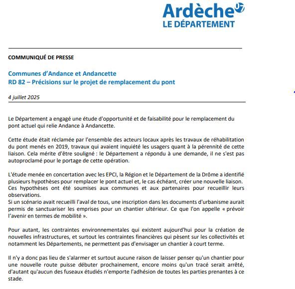 S’il l’a engagée, le Département précise d’abord ne pas s’être autoproclamé pour le portage de l’étude qui avait été réclamée suite aux travaux de réhabilitation réalisés en 2019. A ce moment-là, les élus avaient expliqué qu’il ne fallait pas se contenter de ce chantier et évoquaient un potentiel nouveau pont. « Nous devons prendre nos responsabilités », disait à l’époque Pierre Jouvet, alors président de la communauté de communes de Porte de DrômArdèche, marqué par l’effondrement mortel d’un pont quelques semaines auparavant à Mirepoix-sur-Tarn, en Haute-Garonne. Suite à cette étude, « aucun des fuseaux étudiés n’emporte l’adhésion de toutes les parties prenantes à ce stade », fait aujourd’hui savoir la collectivité ardéchoise.