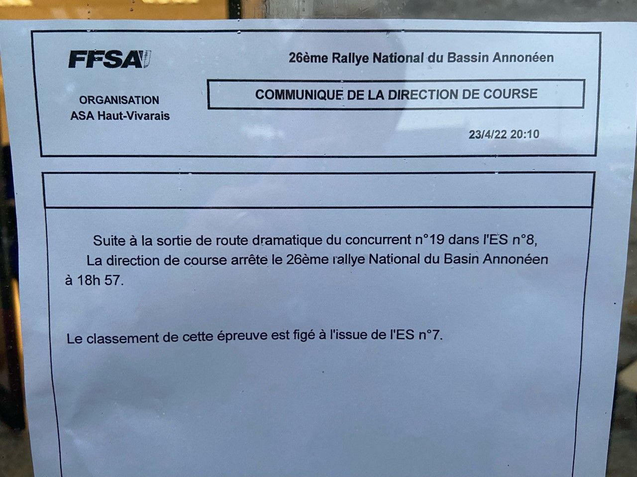 Un terrible drame est survenu ce samedi après-midi lors de l’avant-dernière spéciale du rallye du Bassin d’Annonay. L’équipage n°19 a fait une sortie de route avant de terminer en contrebas. Le véhicule a pris feu, mais l’enquête devra déterminer s’il s’est embrasé avant ou après s’être écrasé. Le pilote et le co-pilote ont perdu la vie. Les pompiers sont sur place pour extraire les victimes du véhicule. 35 secouristes sont engagés. La remise des prix a été annulée. L’ambiance était d’ailleurs très lourde au parc de la Lombardière, tant au sein des organisateurs que chez les équipages inscrits pour cette édition 2022 qui sont rentrés au parc attristés par cette dramatique nouvelle.
