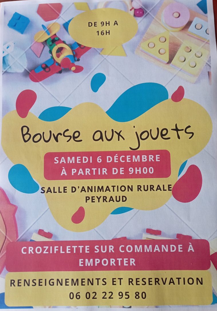 Le sou des écoles de Peyraud organise une bourse aux jouets le samedi 6 décembre à la salle d’animation rurale de Peyraud de 9h a 16h.