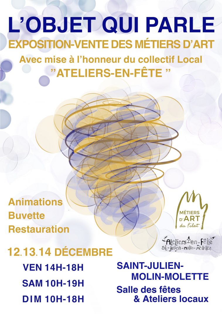 À l’approche des fêtes de fin d’année, l’association des Métiers d’art du Pilat s’associe avec le collectif local « Les Ateliers en Fête » pour une exposition/vente. Trente-deux artisans présenteront leurs réalisations à la salle des fêtes et dans 5 ateliers: céramiques, tissage, vitraux, gravures, illustrations, peintures, sculptures, bijoux, maroquinerie, objets textiles et en bois, tapisserie, biscuits et cueillette locale…