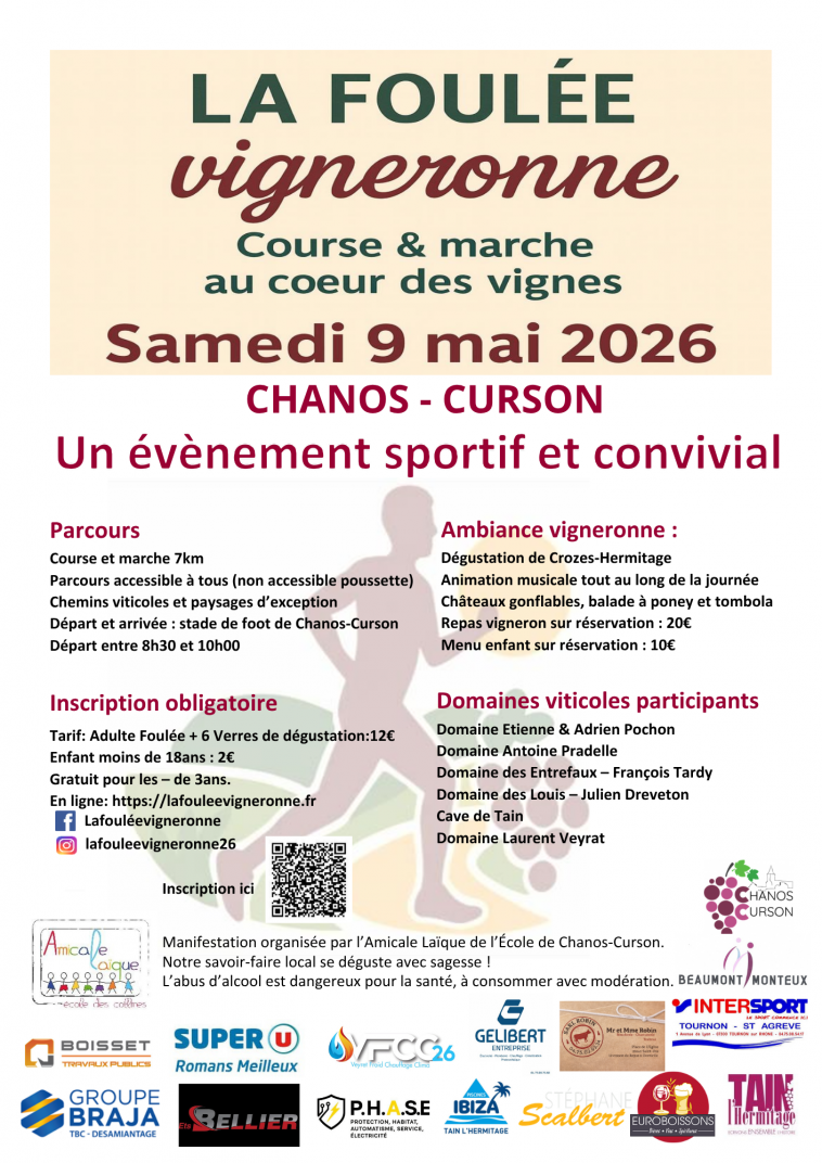 👉 Réservation ici https://www.helloasso.com/associations/amicale-laique-de-l-ecole-de-chanos-curson/evenements/la-foulee-vigneronne-2026