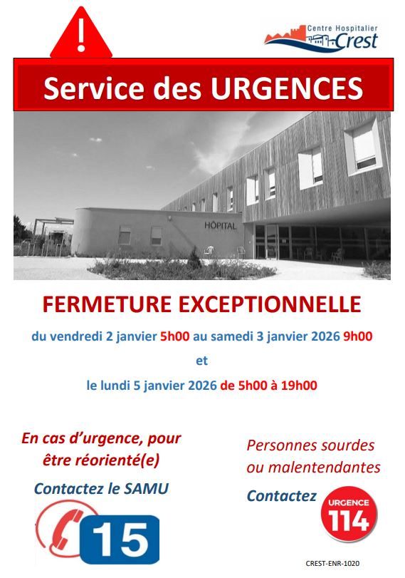 Le service des urgences du centre hospitalier de Crest sera de nouveau fermé, dès ce vendredi 2 janvier à partir de cinq heures, et jusqu’au samedi 3 janvier à neuf heures. Puis lundi 5 janvier, de cinq heures à 19 heures. En cas d’urgence, il est rappelé qu’il faut contacter le Samu en composant le 15, ou, pour les personnes sourdes ou malentendantes, le 114. Les urgences crestoises avaient déjà fermé temporairement le lendemain de Noël.