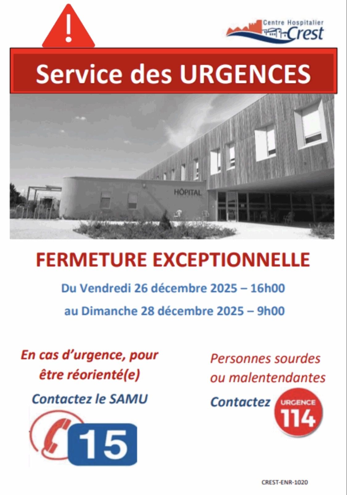 Le service des urgences du centre hospitalier de Crest sera fermé à compter de 16 heures ce vendredi 26 décembre et jusqu’à neuf heures, le dimanche 28 décembre au matin. En cas d’urgence, il est rappelé qu’il faut contacter le 15, ou, pour les personnes sourdes ou malentendantes, le 114. Pour rappel, les urgences de la clinique Pasteur de Guilherand-Granges sont elles aussi fermées ce jeudi et jeudi prochain.