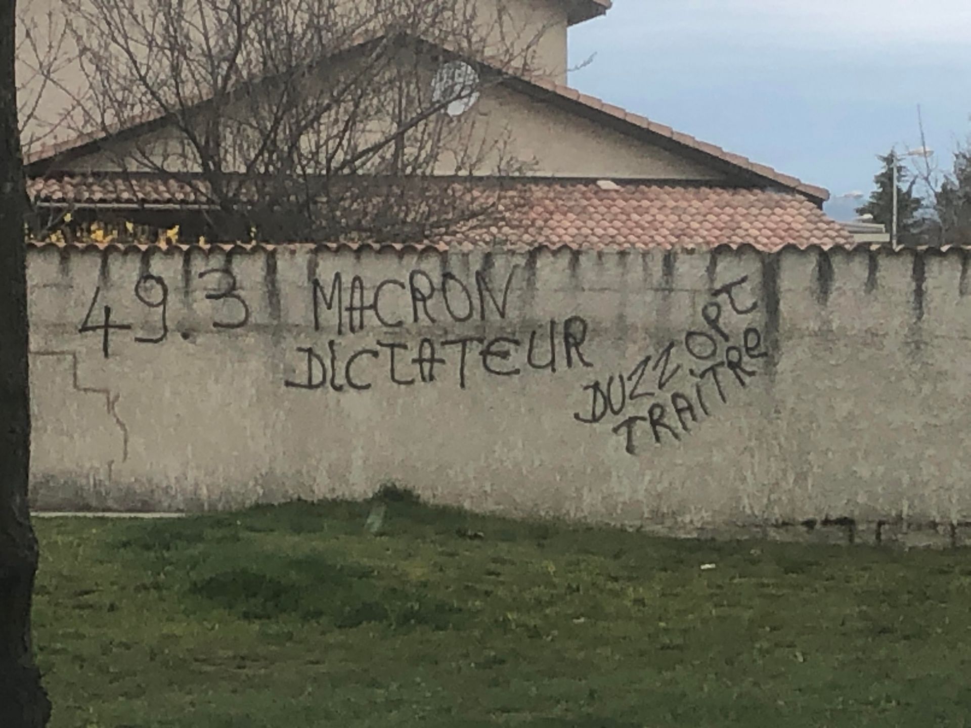 Ces derniers jours, d’autres tags visant notamment le président de la République (« Macron dictateur ») et le ministre du Travail (« Dussopt traître ») ont été retrouvés sur des murs du bassin d’Annonay, région d’origine d’Olivier Dussopt.