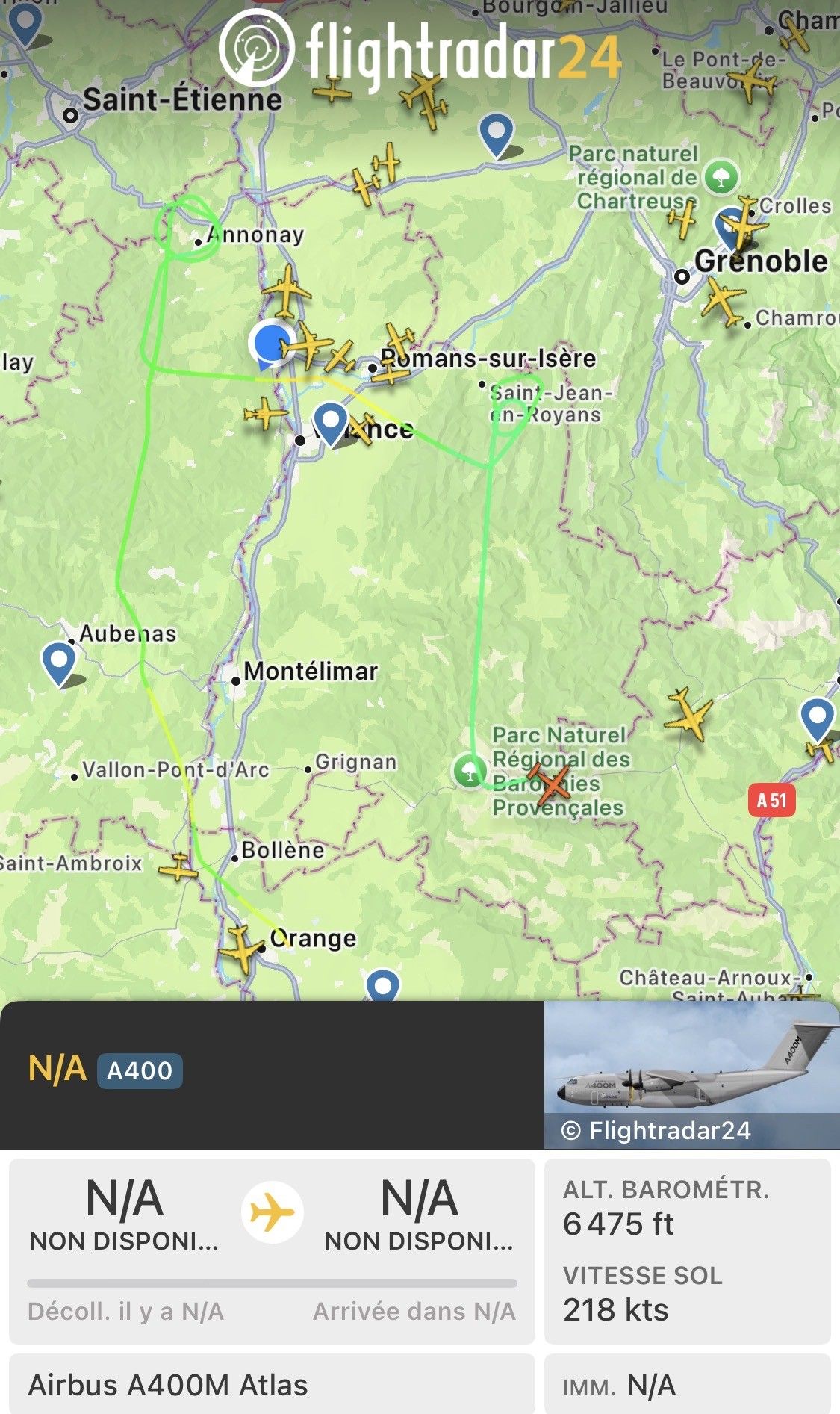 Un gros avion qui survole la région à basse altitude, ce n’est pas courant. En dehors, bien sûr, des environs des aéroports de Chabeuil, Saint-Etienne-de-Saint-Geoirs et Lyon Saint-Exupéry. Ce jeudi matin, un Airbus A400 M Atlas, gros porteur de l’Armée, est ainsi passé au dessus de l’Ardèche, du sud au nord, a fait plusieurs boucles autour du bassin d’Annonay, avant de survoler la vallée du Doux dans la région de Tournon, et de mettre le cap sur le territoire de Romans, puis survoler les Baronnies. Lorsque nous l’avons repéré, l’avion de transport militaire naviguait, selon le site internet FlightRadar24, à une altitude autour de 4650 pieds, soit environ 1400 mètres.
