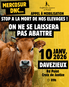 Tracteurs et animaux sont attendus sur place, mais la circulation ne devrait pas être totalement entravée. Le syndicat a, comme d’autres, échangé avec le Premier ministre Sébastien Lecornu, mais ses représentants disent n’avoir obtenu aucune réponse et appellent donc à amplifier les mobilisation. Les producteurs et éleveurs protestent notamment contre l’accord entre l’UE et le Mercosur, qui pourrait être signé ce vendredi, mais aussi contre la gestion du Gouvernement au sujet de la dermatose nodulaire contagieuse qui affecte les bovins. « On ne se laissera pas abattre », promettent les agriculteurs sur leur affiche.