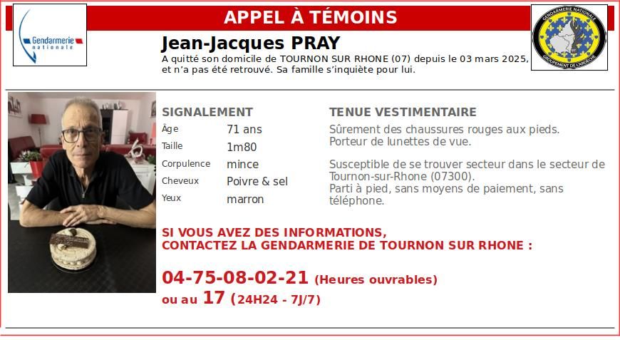 Jean-Jacques Pray pourrait se trouver dans le secteur de Tournon. Si vous avez des informations concernant cette disparition, il faut contacter la brigade de gendarmerie locale au 04 75 08 02 21 (heures ouvrables) ou directement le 17.
