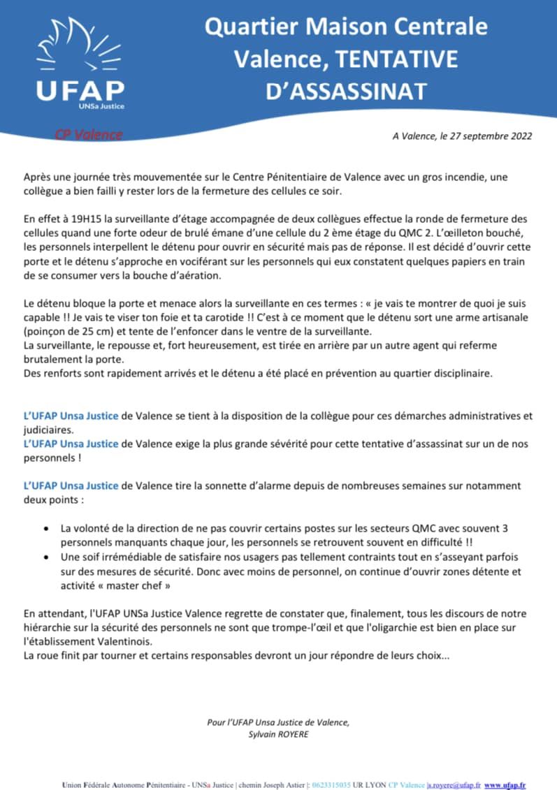 En début de soirée, une gardienne a par ailleurs été violemment agressée par un détenu. « Une collègue a bien failli y rester », toujours selon le syndicat UFAP Unsa Justice qui parle de tentative d’assassinat. La victime et ses deux collègues effectuaient leur ronde pour fermer les cellules quand ils ont senti une odeur de brûlé émanant d’une cellule du Quartier Maison-Centrale. Sans réponse du détenu occupant la cellule, les gardiens ont alors ouvert la porte. Le prisonnier aurait menacé la gardienne, en lui disant notamment « Je vais te montrer de quoi je suis capable », avant de sortir un poinçon de 25 cm et de tenter de l’enfoncer dans son ventre. Heureusement, la surveillante a été tirée en arrière par son collègue et n’a pas été blessée. L’agresseur a été placé dans le quartier disciplinaire. Le syndicat dénonce une nouvelle fois un manque de personnel. Le centre pénitentiaire de Valence avait récemment fait parler de lui lorsqu’un détenu s’était évadé, à l’occasion d’une sortie au Zoo d’Upie, avant d’être retrouvé.