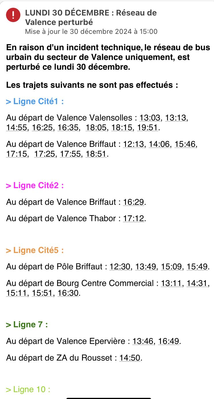 Sur les réseaux sociaux, Valence Romans Mobilités, qui gère le réseau, évoque « un incident technique majeur » et conseille de regarder les horaires en temps réel sur l’application Valence Romans Mobilités. Selon un dirigeant de Citéa, les pots devraient être remplacés un par un, ce qui devrait permettre aux bus de circuler normalement lundi prochain, jour de reprise des élèves après les vacances de Noël.